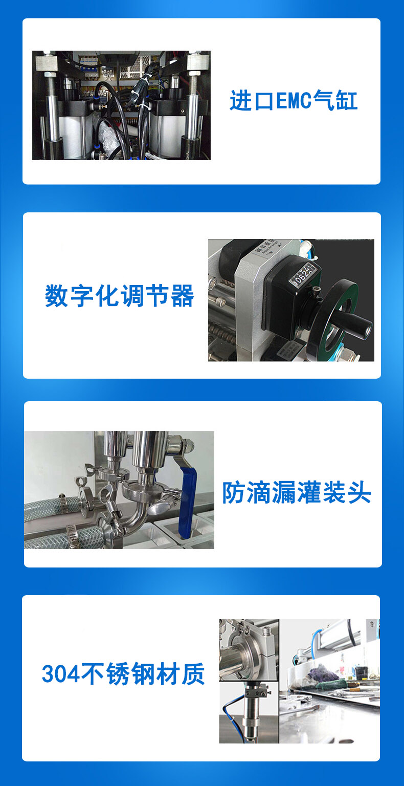 本機(jī)是針對乳品、煉乳(rǔ)、固體飲料等液體/膏體包裝精心設計(jì)的1-5L任意可調的新一代包裝設備。采用微電腦PLC自動控製、人機界麵、全封閉、下潛式灌裝(zhuāng)。計量精度高,灌裝範(fàn)圍大(dà),結構緊湊,運行平穩,適合於各種規則形狀的容器灌裝,液缸及其管道拆卸、清洗,方便快捷。
